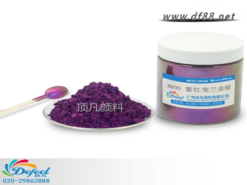 8600 紫紅變藍金綠變色龍粉其變色原理為吸收特定波長之紫外光源,藉由該光源之能量而產生顏色變化(變為紫色、紅色、黃色、天空蘭色),當特定波長的紫外光源不在時,即回復原來的顏色。